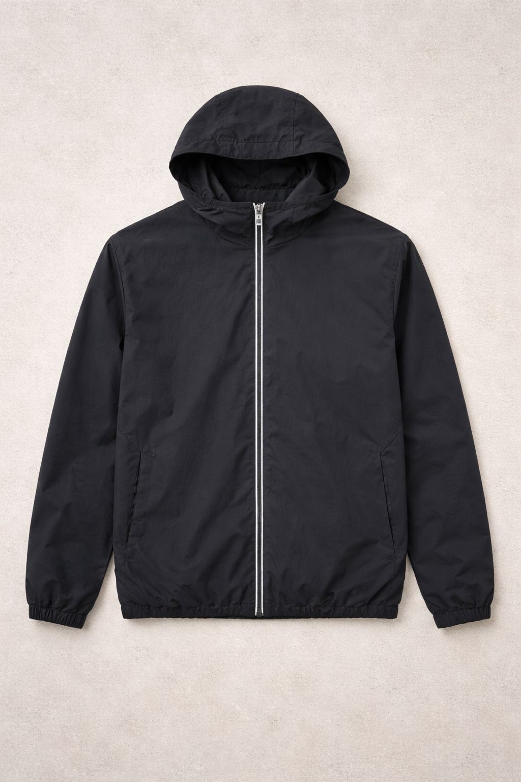 Designed with a clean, minimalist aesthetic, this jacket features a full-length zip closure with contrast piping, an adjustable hood, and elasticated cuffs and hem for a secure fit. The sleek navy tone makes it easy to pair with any outfit—perfect for layering over casual tees or smart-casual looks.
